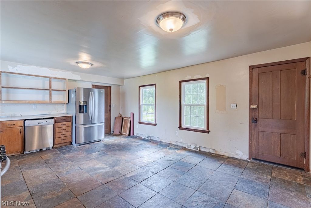 Welcome to 9440 Avery Rd in Broadview Heights, a colonial-style home with rustic charm and a unique, flexible layout. Enter through the front door into a bright living room filled with natural light from multiple windows. A nearby side entrance leads into a spacious kitchen, offering slate tile flooring, wood cabinetry, stainless steel appliances, and plenty of room for an island or eat-in area. The main level includes two generously sized rooms with wood flooring. These spaces can function as bedrooms, home offices, or additional living areas. Upstairs, you'll find an additional bedroom and a full bathroom, creating a more private retreat. The home also includes a partial unfinished basement, providing storage and utility space, along with a conveniently located laundry area and forced air heating. Outside, mature greenery surrounds the property, offering a sense of privacy and a peaceful setting. This home offers character, flexibility, and the opportunity to make it your own in a desirable Broadview Heights location.